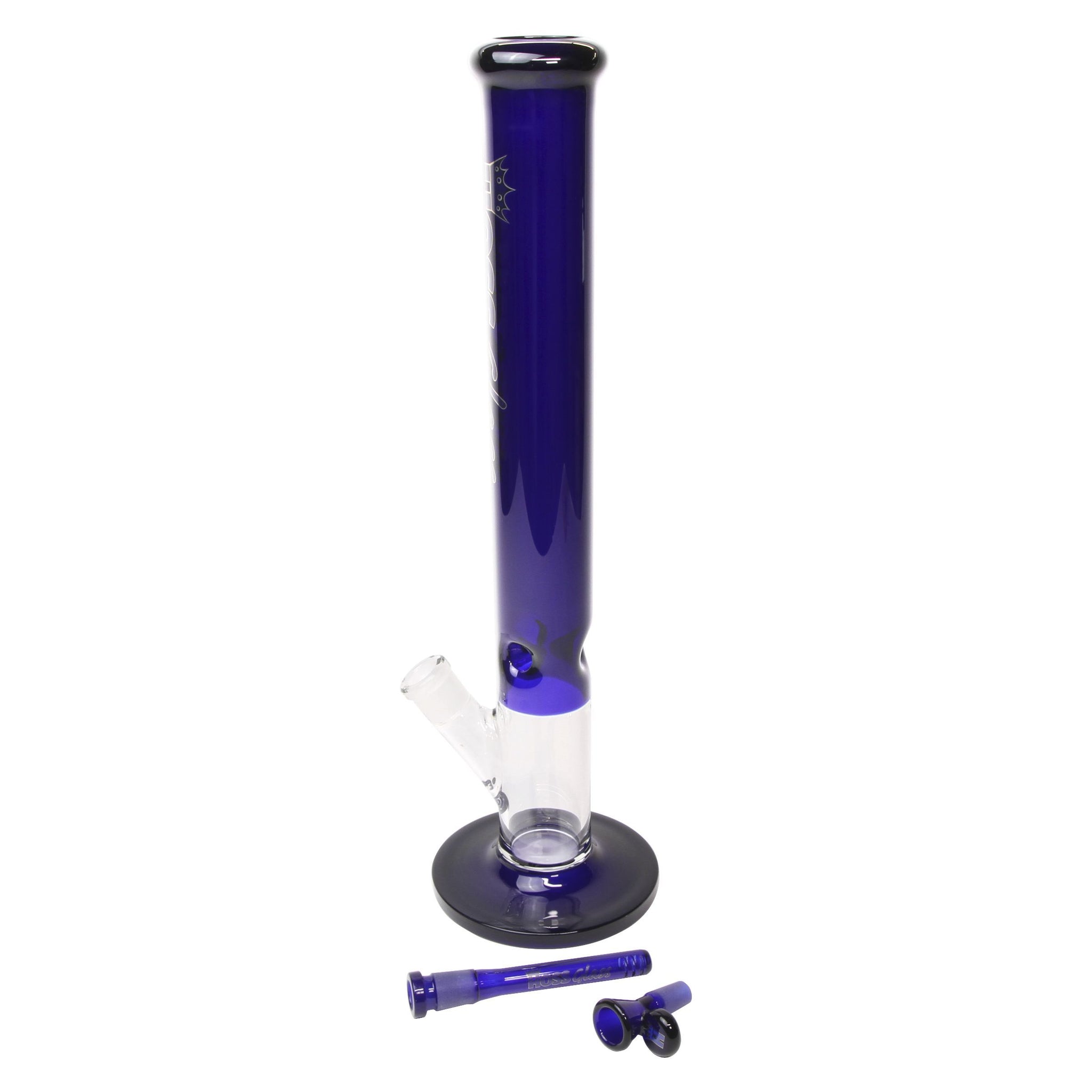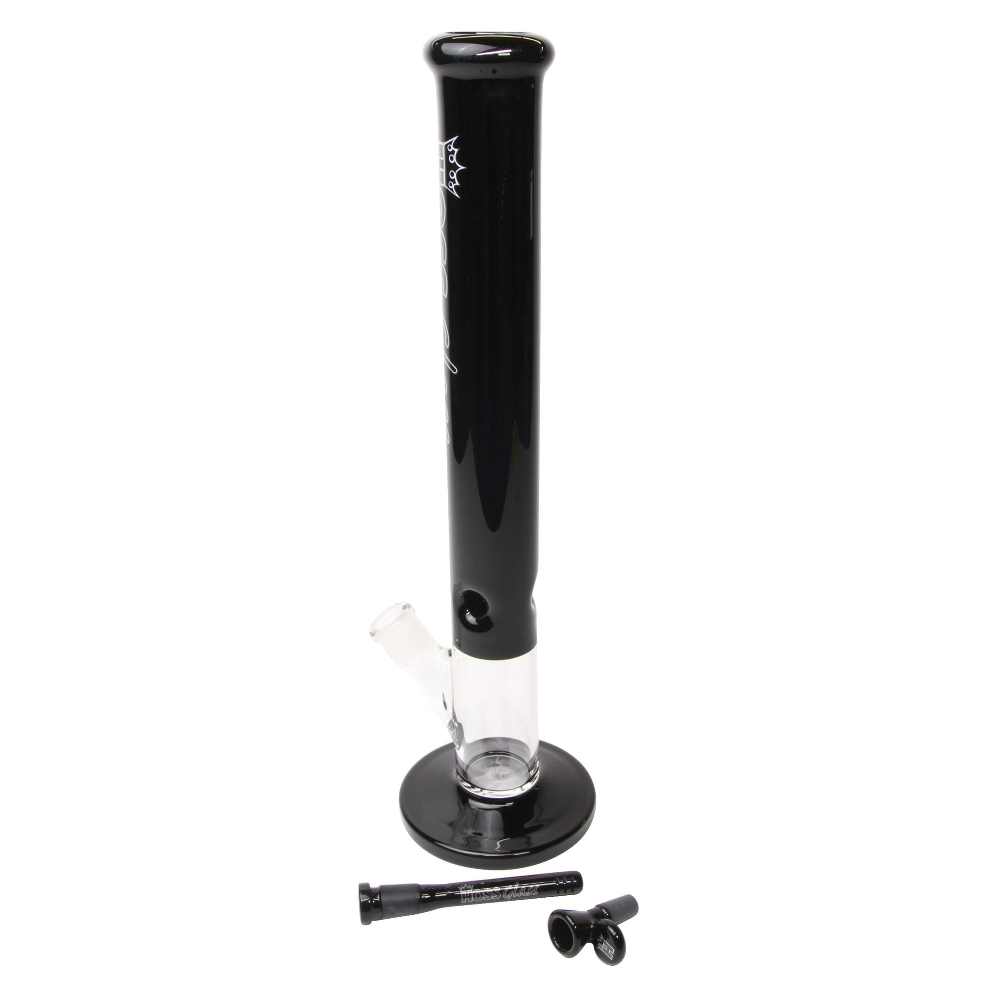 This product is final sale. Hoss Glass’s 18" Full Colour bong offers a straight-shaped base with a 3/4" downstem diffuser for percolation. The clear window base makes it easy to see when the water needs to be changed or the glass needs to be cleaned. The ice catcher is located right at the bottom of the neck, which allows more ice to be placed inside to further cool down the smoke. This water pipe is available in two colours: black or blue.