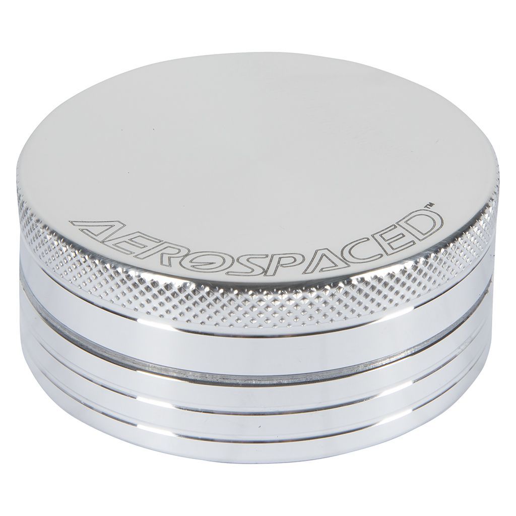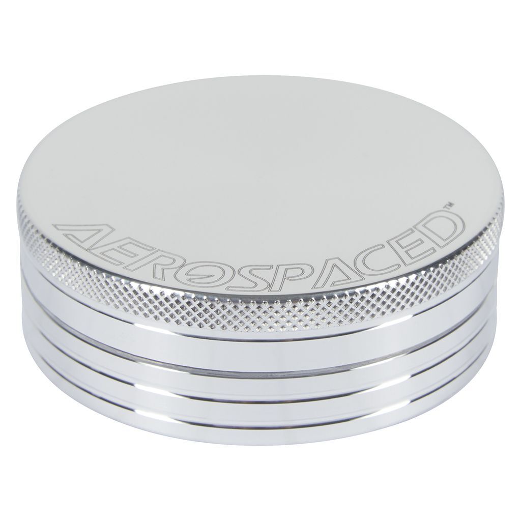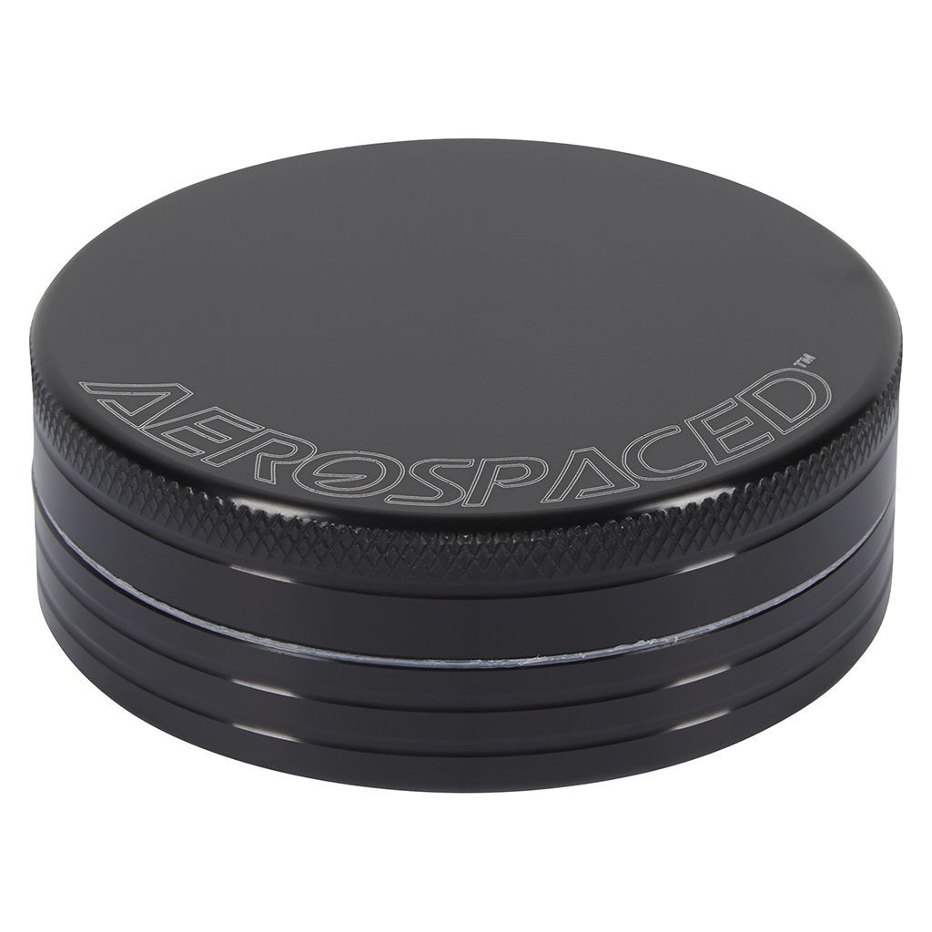 A black five-centimetre-wide two-piece grinder from Aerospaced with an anodized coating, razor-sharp teeth, a carrying pouch and a lifetime warranty. All sales are final.