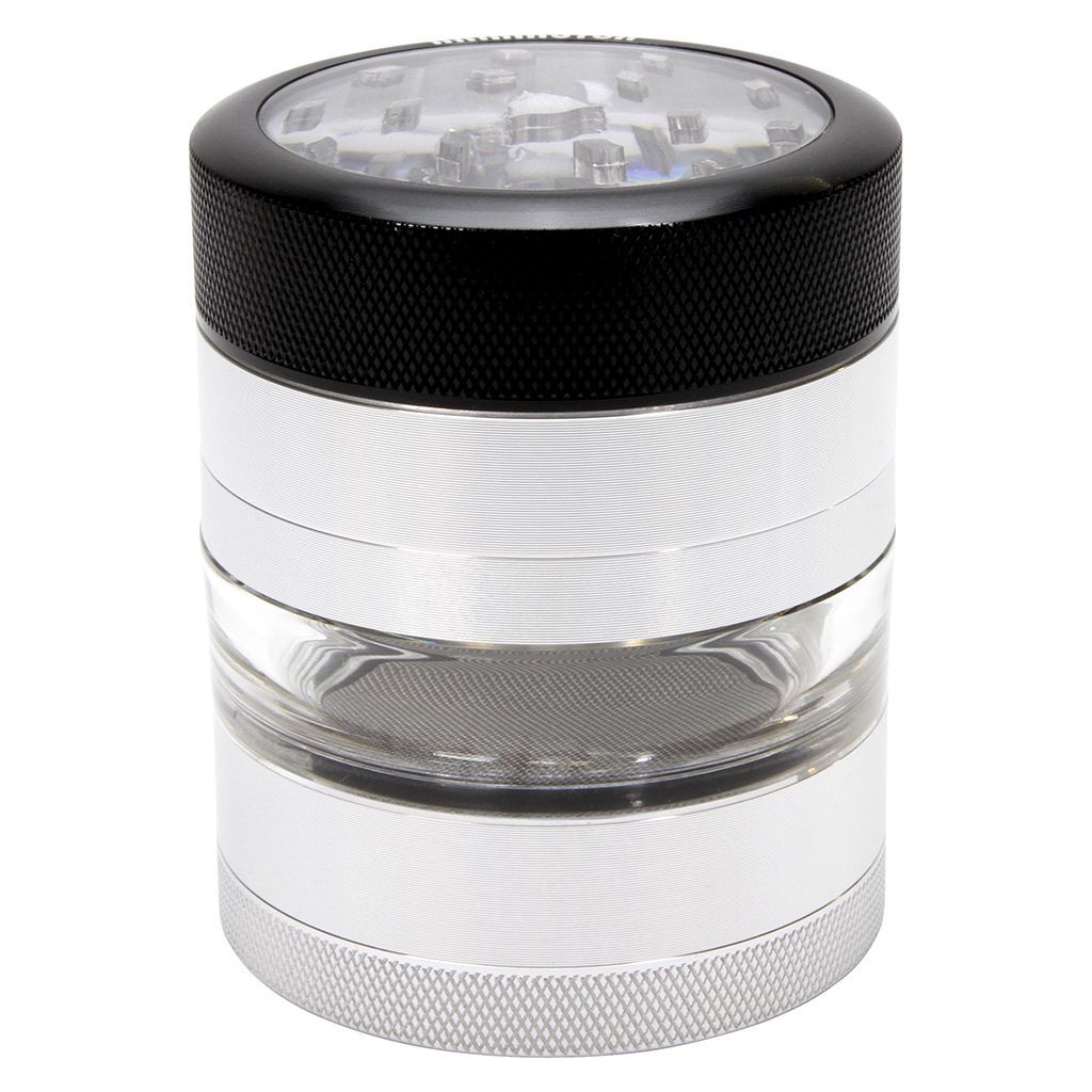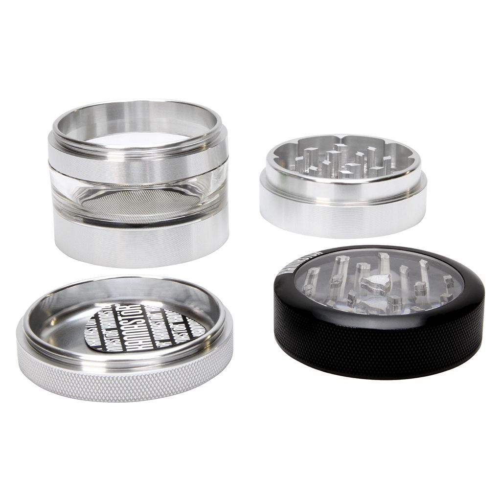 Kannastor’s 6.4-centimetre four-piece grinder is made from durable aluminum and fit with a clear jar body so you can see how much you’ve ground up. It features a magnetic air-tight lid to secure dried flower in place, and its drop-through hole design keeps larger pieces from falling through. It has a secure grip with grooved external edges for easy use, and a monofilament screen to separate the pollen. Available in multiple colours, this grind-er comes with a limited lifetime warranty, a guitar pick scraper and a carrying bag. All sales are final.