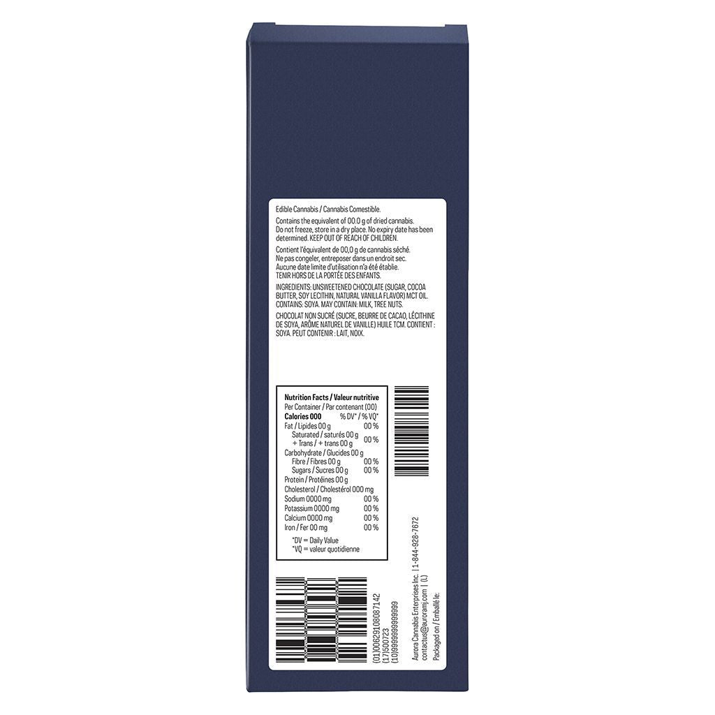 Aurora’s 64% Cocoa Dark Chocolate Squares are infused with a sativa-dominant distillate that delivers 2 mg of THC per square (10 mg total).