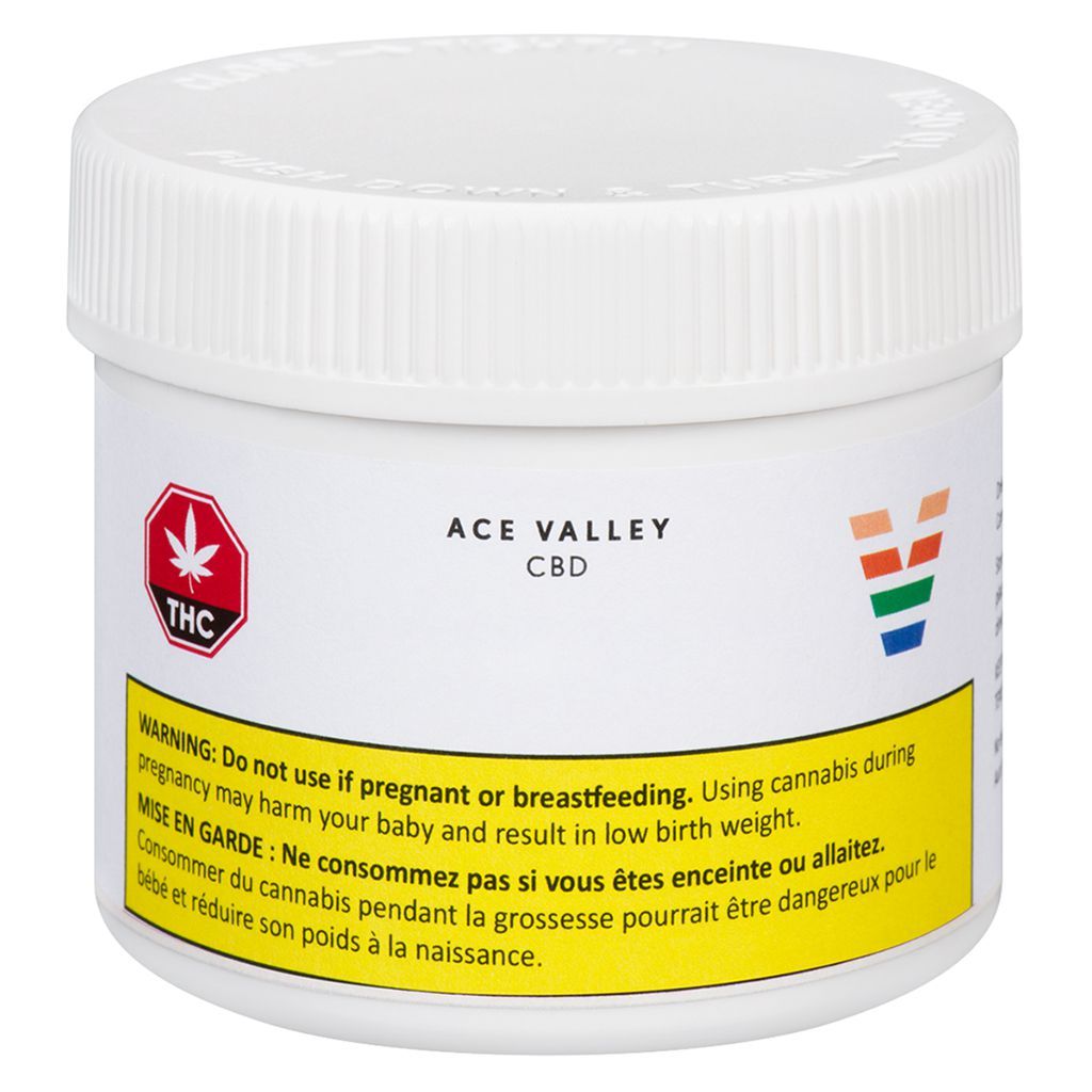 Flowr’s Ace Valley CBD is an indoor-grown hybrid from the Okanagan Valley in BC. It has a purple colouring with a thick layer of orange, red and blue hairs, very mild THC potency and an earthy taste with fruity undertones created by the myrcene, beta- and trans-caryophyllene, limonene and terpinene in its terpene profile. It’s hand-trimmed, hang-dried and available as 3.5 g, and 7 g of dried flower.